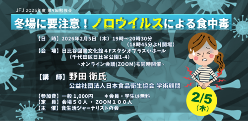 今年も冬場の流行が危惧されているノロウイルスによる食中毒の感染原因と予防対策について、ウイルス性食中毒研究の第一人者である野田衛先生よりうかがいますので、ご参集ください。